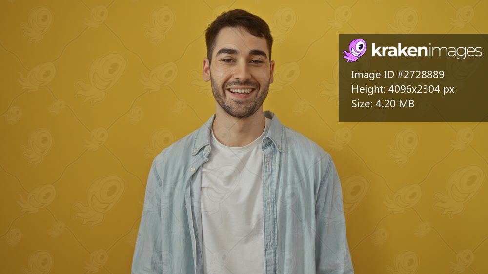 Young hispanic man smiling confidently against a warm isolated yellow background showcasing an attractive adult male with a friendly expression in a casual portrait. - Kraken Images