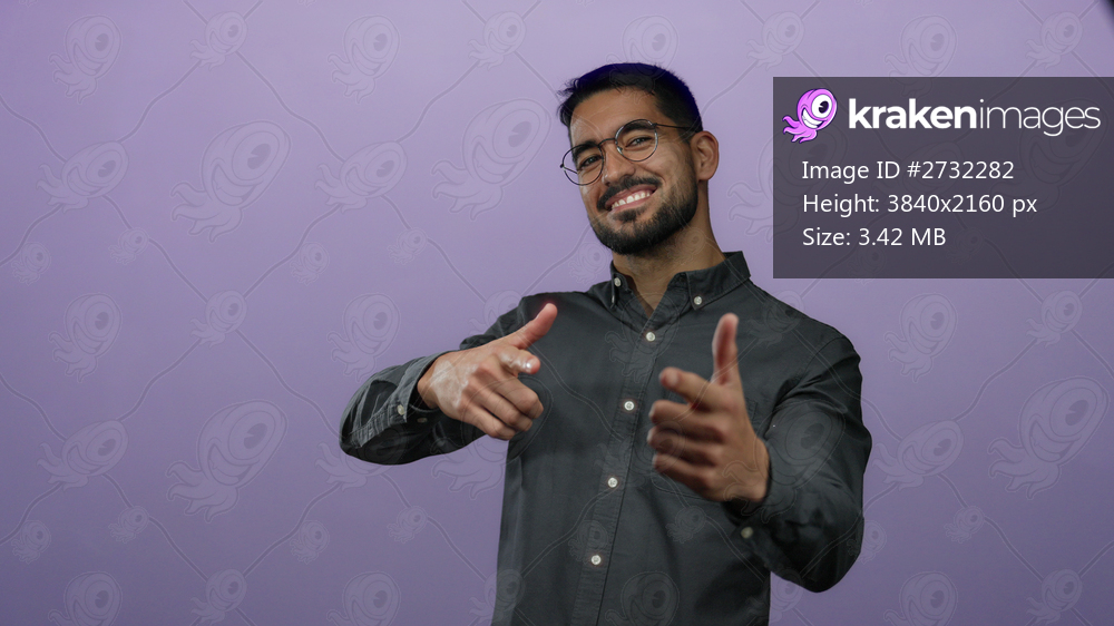 Young hispanic man smiling confidently with glasses against a purple background in a casual portrait setting highlighting charm and positive vibes.
