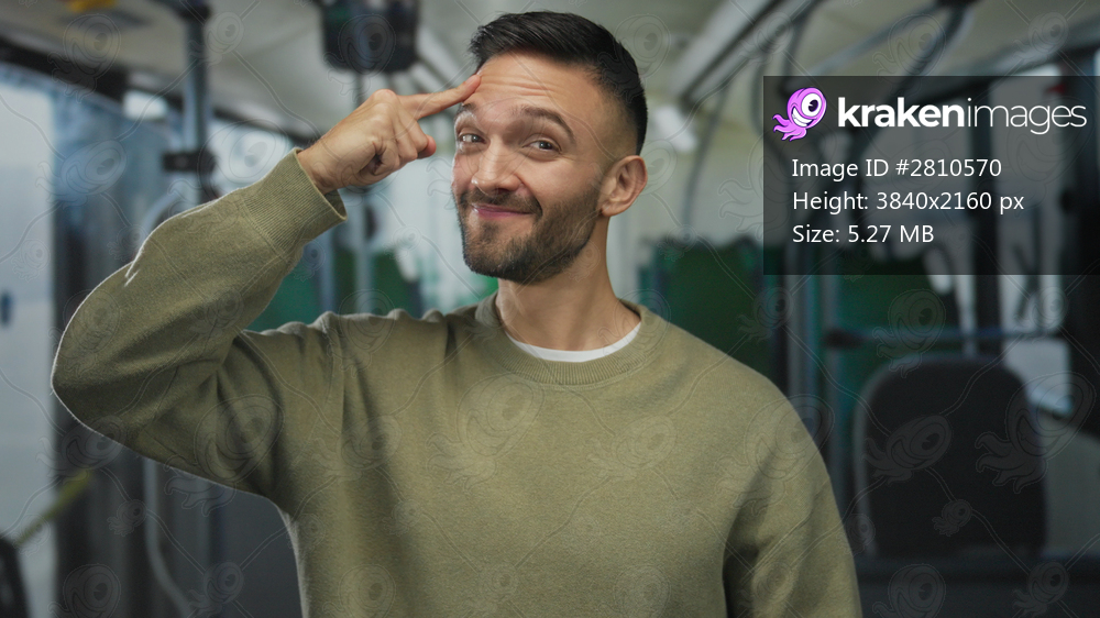 Young hispanic man smiling confidently on a bus while gesturing at his head in a casual sweater showcasing a lively and indoor commuting scene with a cheerful vibe and ambient lighting - Kraken Images