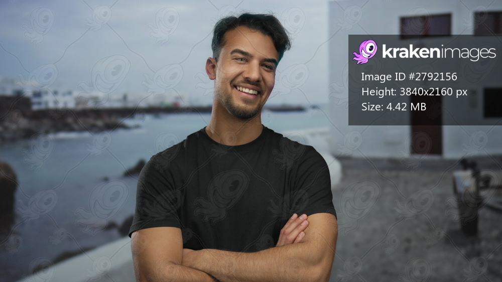 Young hispanic man smiling confidently on seaside promenade with arms crossed, serene ocean backdrop enhancing outdoor setting.