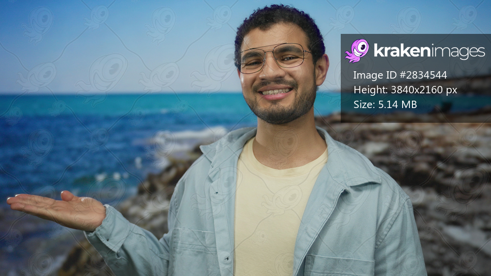Young hispanic man smiling extends left palm presenting turquoise sea and rocky shoreline on sunlit beach; serenity.