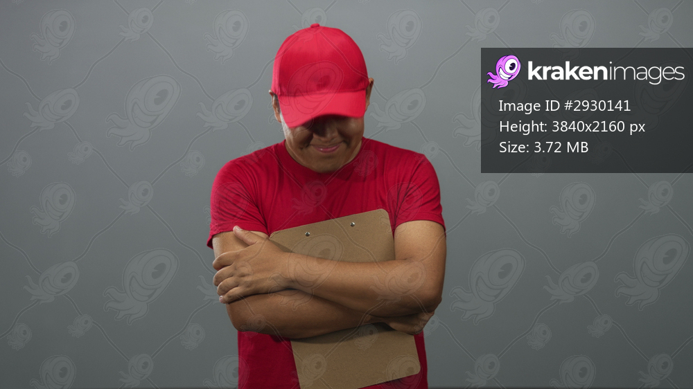 Young hispanic man smiling with eyes closed hugging clipboard with crossed arms wearing red cap and red shirt in gray studio; contentment duty care.
