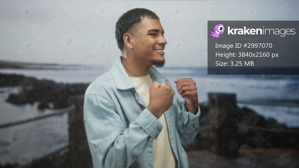 Young hispanic man smiling with fists raised playfully, face turned toward a studio beach backdrop wearing a light blue jacket; hopeful joy.