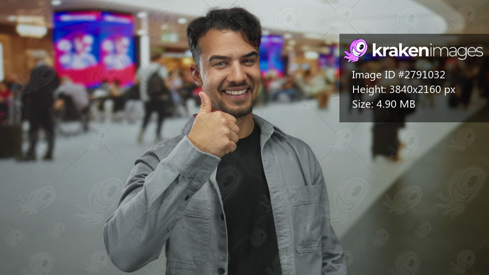 Young hispanic man smiling and giving thumbs up in a busy airport indoor setting with people in the background creating a lively and energetic travel atmosphere - Kraken Images
