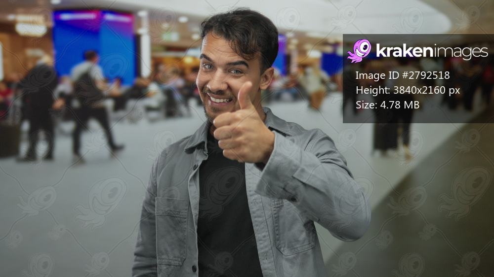 Young hispanic man smiling and giving thumbs up in a busy airport indoor setting with people in the background creating a lively and energetic travel atmosphere - Kraken Images