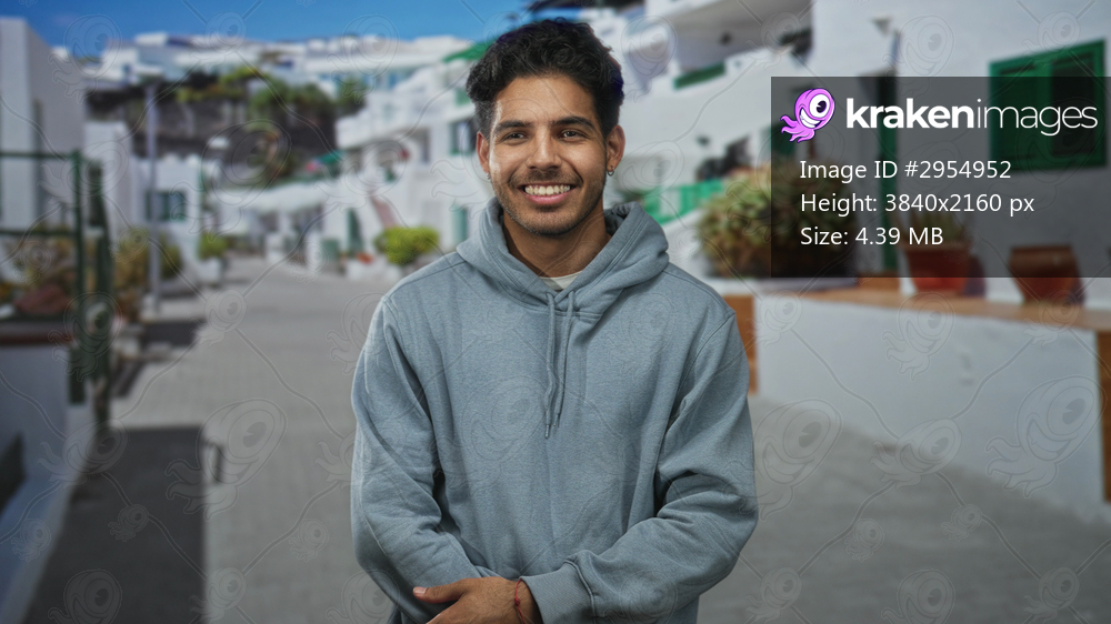 Young hispanic man smiling with hands clasped and casual hoodie on a sunlit whitewashed street; relaxed confidence.