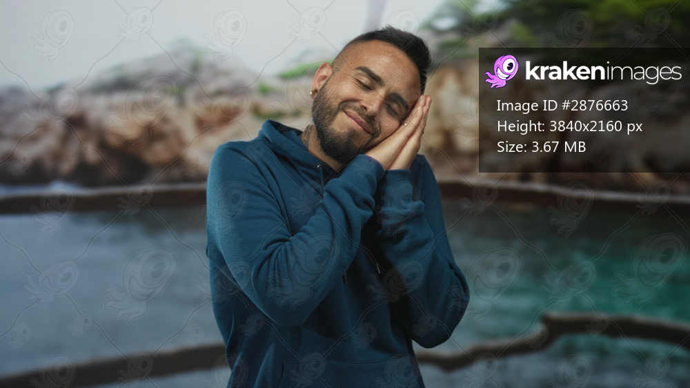 Young hispanic man smiling with hands pressed to cheek in studio by rocky seaside backdrop, wearing blue hoodie and wedding ring; serenity.
