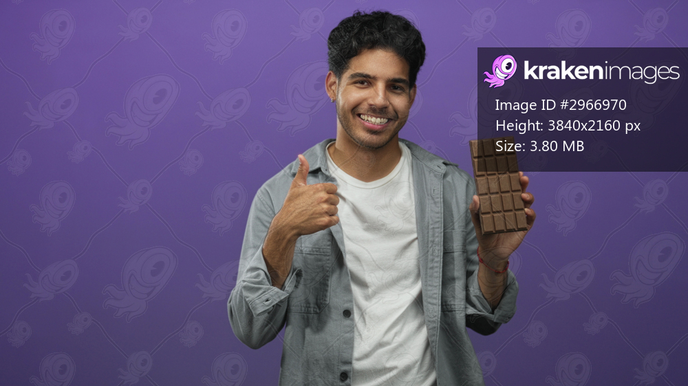 Young hispanic man smiling, holding a chocolate bar in his right hand and showing thumbs up against a purple studio backdrop; happiness.