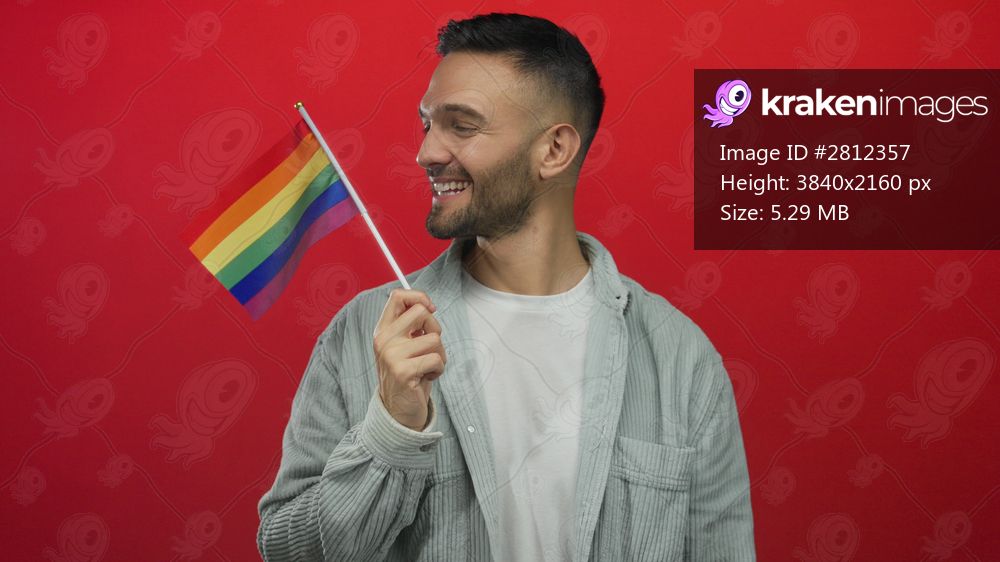 Young hispanic man smiling and holding a colorful lgtb flag against a vibrant red background radiating pride and joy in an expressive portrait.