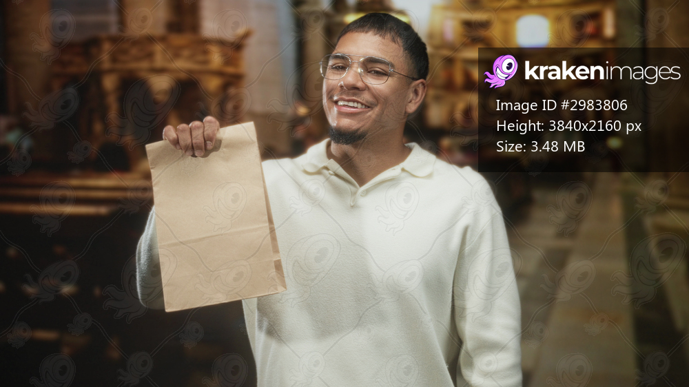 Young hispanic man smiling and holding a paper bag by hand in building aisle; courteous delivery friendly.