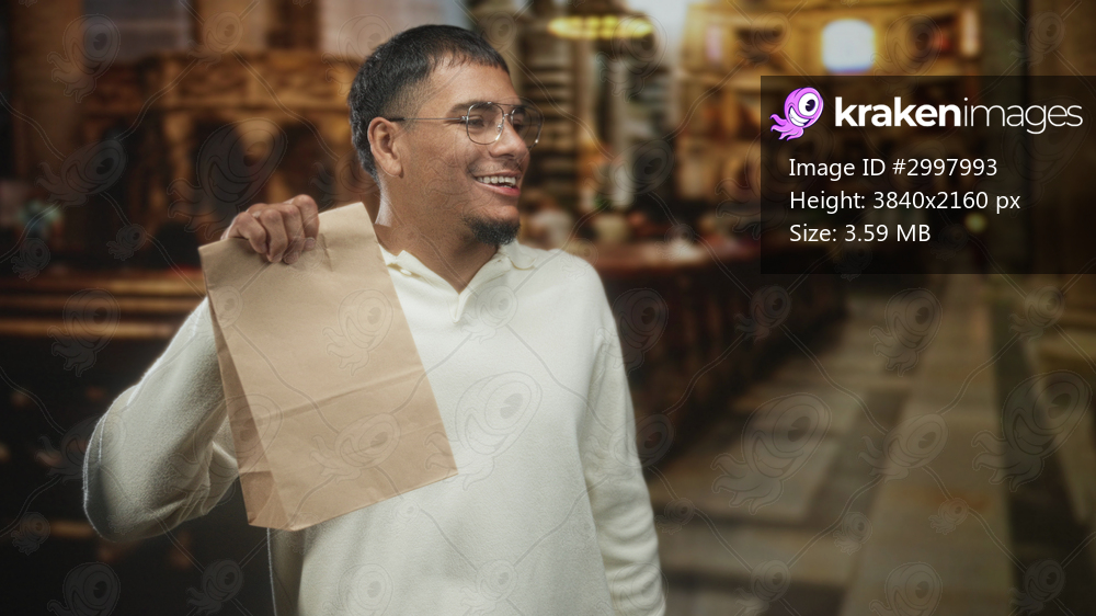 Young hispanic man smiling and holding a paper bag by hand in building aisle; courteous delivery friendly.