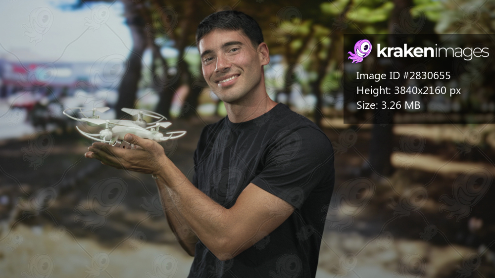 Young hispanic man smiling holds drone with hands in green park; excitement innovation exploration technology.