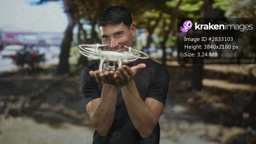 Young hispanic man smiling holds drone with hands in green park; excitement innovation exploration technology.