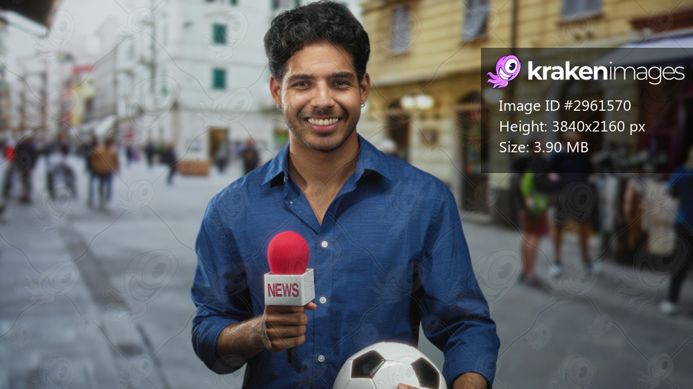 Young hispanic man smiling holds red microphone and soccer ball on street; sports reporting enthusiasm.
