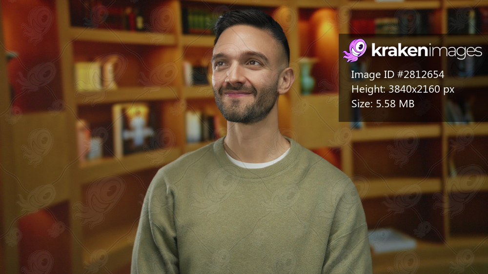 Young hispanic man smiling in a library filled with bookshelves and soft lighting, wearing casual clothing and appearing content in an indoor setting.