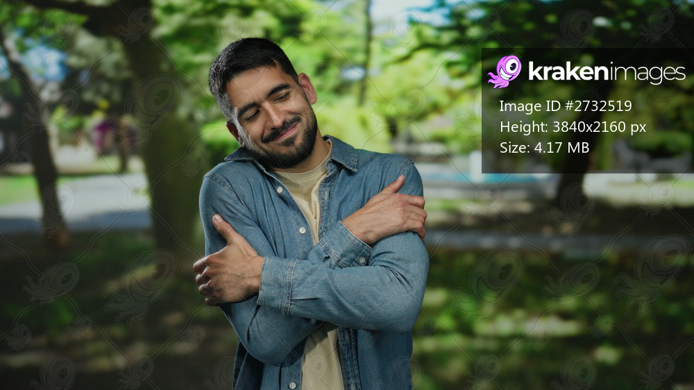 Young hispanic man smiling in a peaceful park setting, with arms crossed embracing himself under the lush green trees, exuding a sense of relaxation and contentment outdoors. - Kraken Images