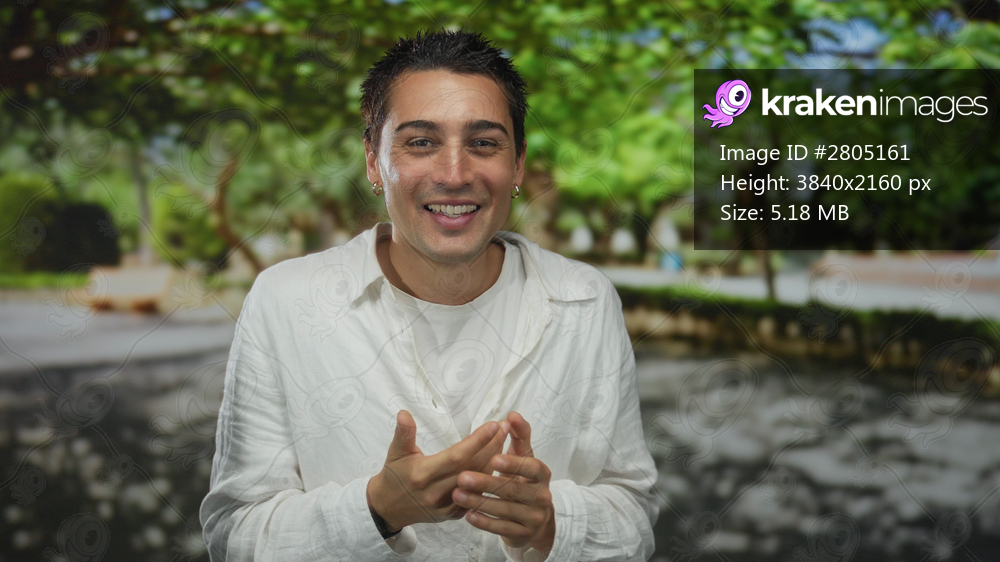 Young hispanic man smiling in a sunny park outdoors wearing a white shirt surrounded by green trees creating a serene and relaxed atmosphere ideal for lifestyle content. - Kraken Images