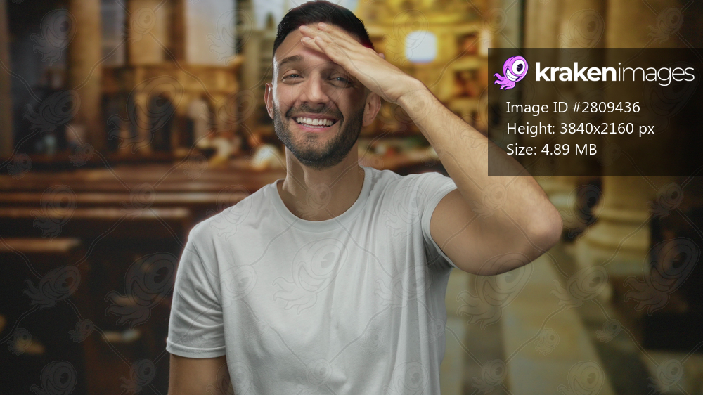Young hispanic man smiling indoors at church surrounded by architectural faith elements and religious atmosphere, wearing casual white shirt with relaxed demeanor. - Kraken Images