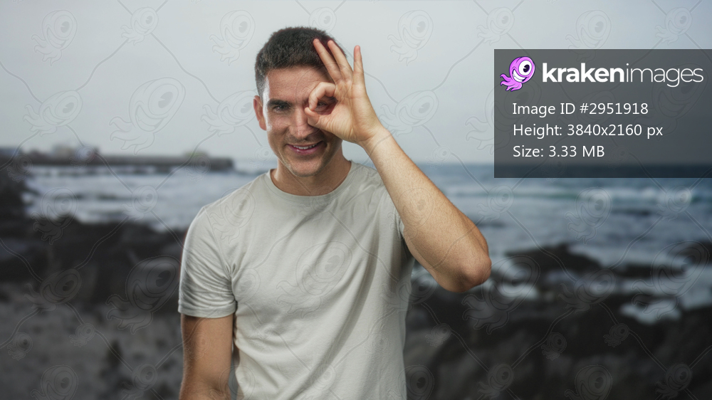 Young hispanic man smiling and making ok sign with right hand by the rocky coast at street near a pier; youthful joy.