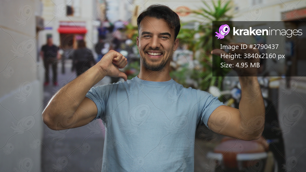Young hispanic man smiling on a busy city street with vibrant outdoor atmosphere and urban background