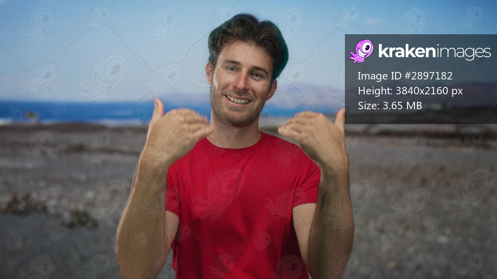Young hispanic man smiling with open palms at rocky seaside outdoors in red t shirt, facing camera and leaning slightly forward; joy.