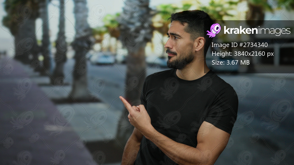 Young hispanic man smiling outdoors in a sunny urban city street with trees and cars, wearing casual black shirt, showcasing positive energy and confidence. - Kraken Images