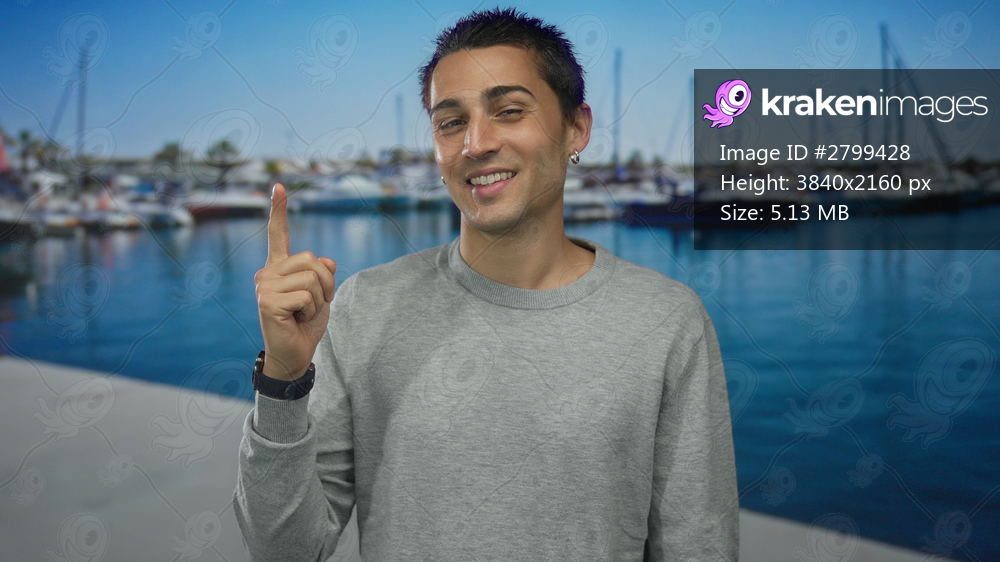 Young hispanic man smiling outdoors near a marina with boats in the background, pointing upwards with a joyful expression