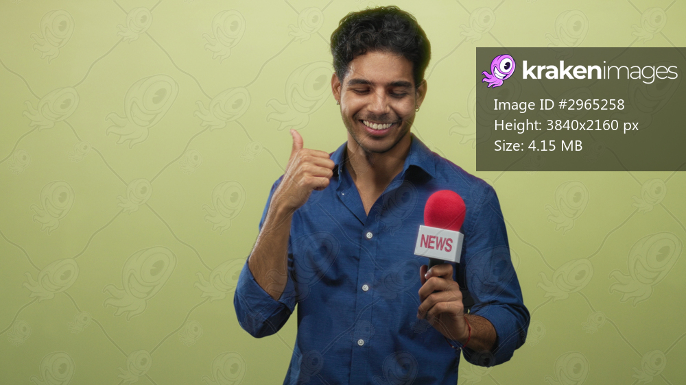 Young hispanic man smiling and pointing finger at red news microphone held in studio with plain green backdrop; confidence upbeat.