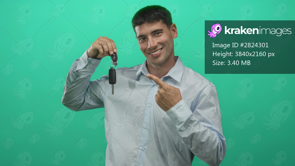 Young hispanic man smiling points finger to car key in studio; confidence success achievement opportunity.