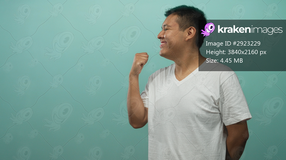 Young hispanic man smiling and raising a fist while wearing white t shirt in teal studio; confidence.