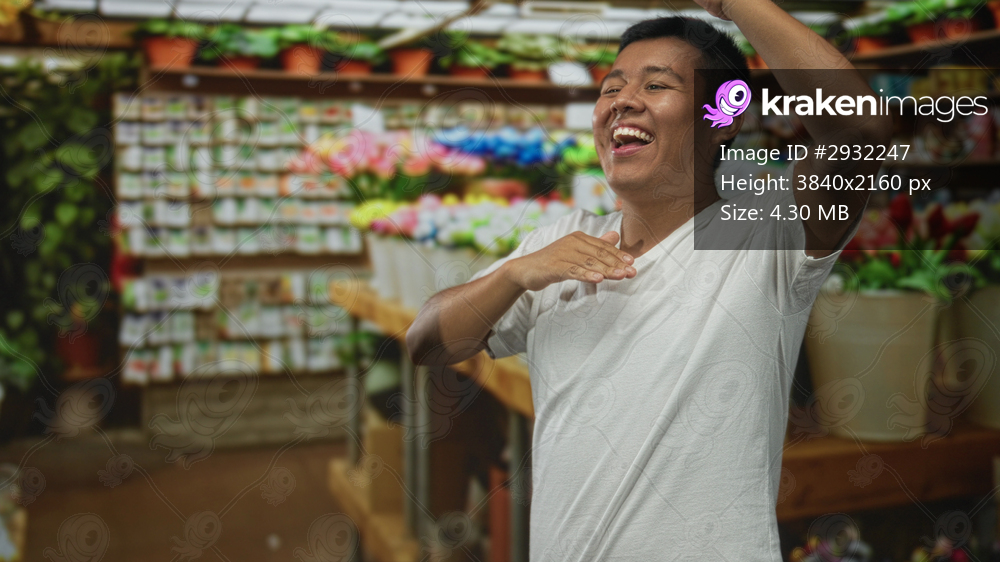 Young hispanic man smiling and raising hand beside a colorful flower display in a market building; joyful.