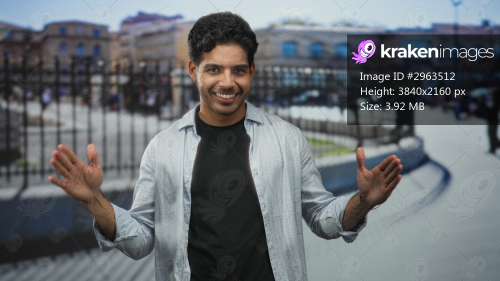 Young hispanic man smiling and showing open hands with palms outward, wearing a black tee and unbuttoned light shirt in front of an iron fence on a street; confidence. - Kraken Images