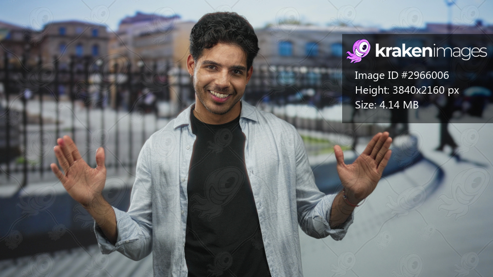 Young hispanic man smiling and showing open hands with palms outward, wearing a black tee and unbuttoned light shirt in front of an iron fence on a street; confidence. - Kraken Images