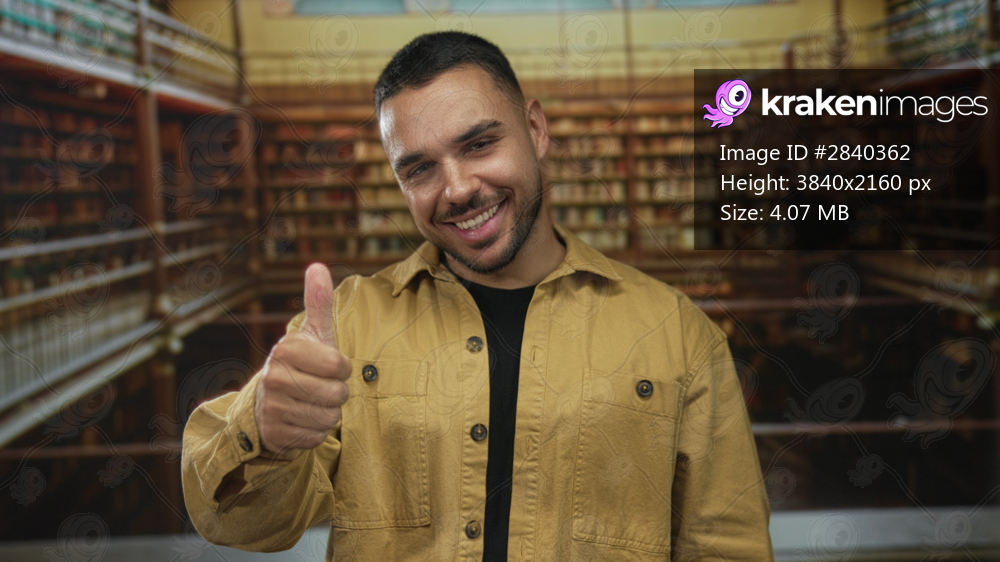 Young hispanic man smiling shows thumb up gesture in old library building lined with wooden shelves; optimism.