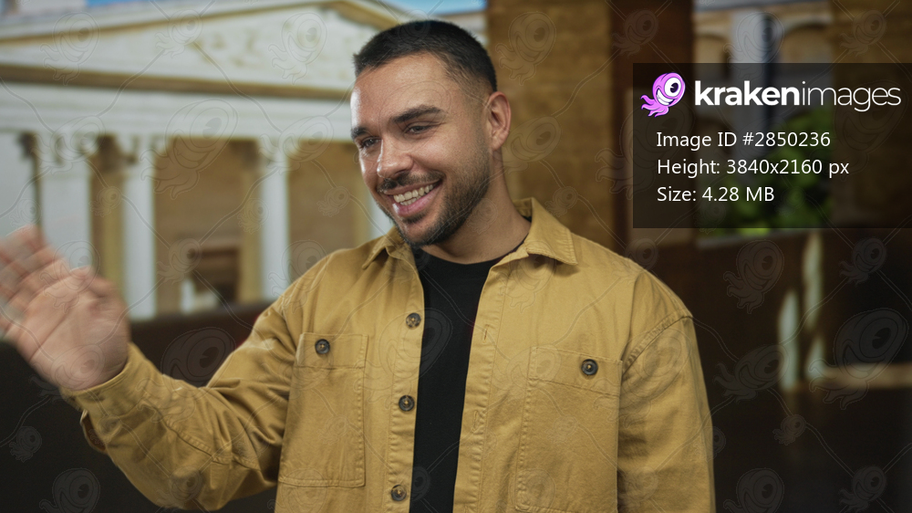 Young hispanic man smiling and waving hand in city street with classical building facade; friendly greeting.