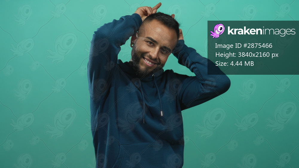 Young hispanic man smiling, wearing navy hoodie, hands behind head making bunny ears in studio teal; playful joy.