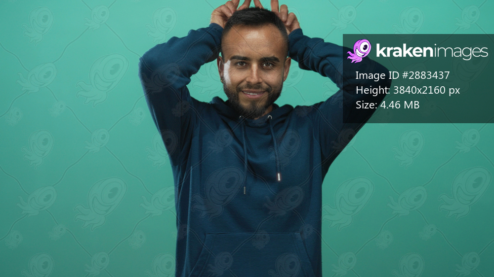 Young hispanic man smiling, wearing navy hoodie, hands behind head making bunny ears in studio teal; playful joy.