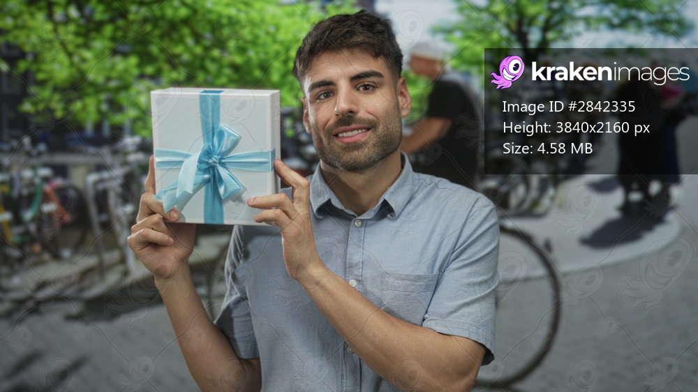 Young hispanic man smiling while holding white gift box with blue ribbon on city street; celebration joy.