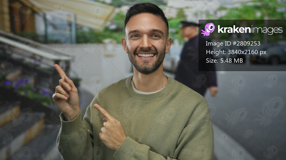 Young hispanic man smiling while pointing in urban street setting with cars and blurred background outdoors daytime casual
