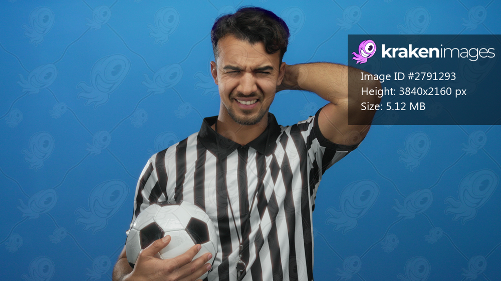 Young hispanic man soccer referee in striped shirt holding ball with thoughtful expression over isolated blue background.