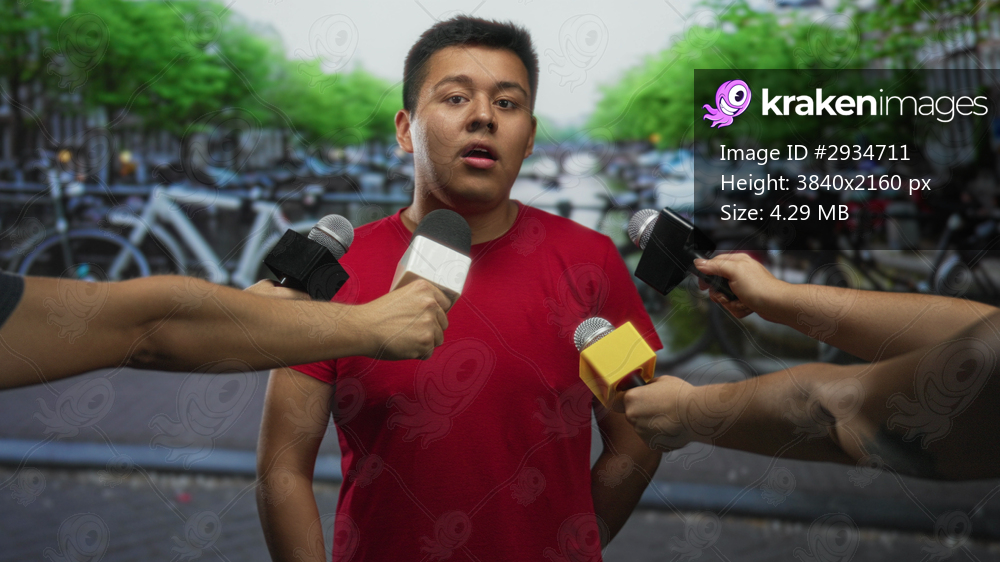 Young hispanic man speaking into multiple handheld microphones on a street by an amsterdam canal, hand on stomach and mouth open; anxiety pressure scrutiny. - Kraken Images