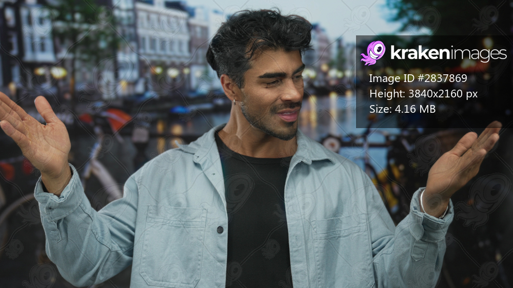 Young hispanic man spreads hands wide on street lined with buildings; welcome invitation openness connection.