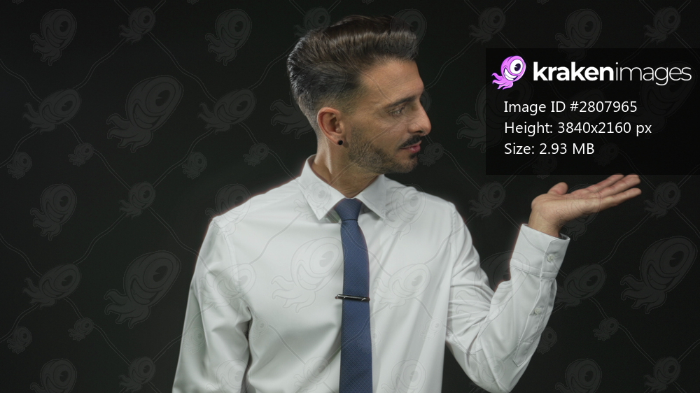 Young hispanic man spreads palms in black studio while wearing white shirt and blue tie and looking aside; uncertainty.