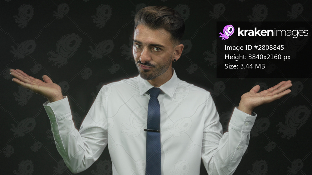 Young hispanic man spreads palms in black studio while wearing white shirt and blue tie and looking aside; uncertainty.