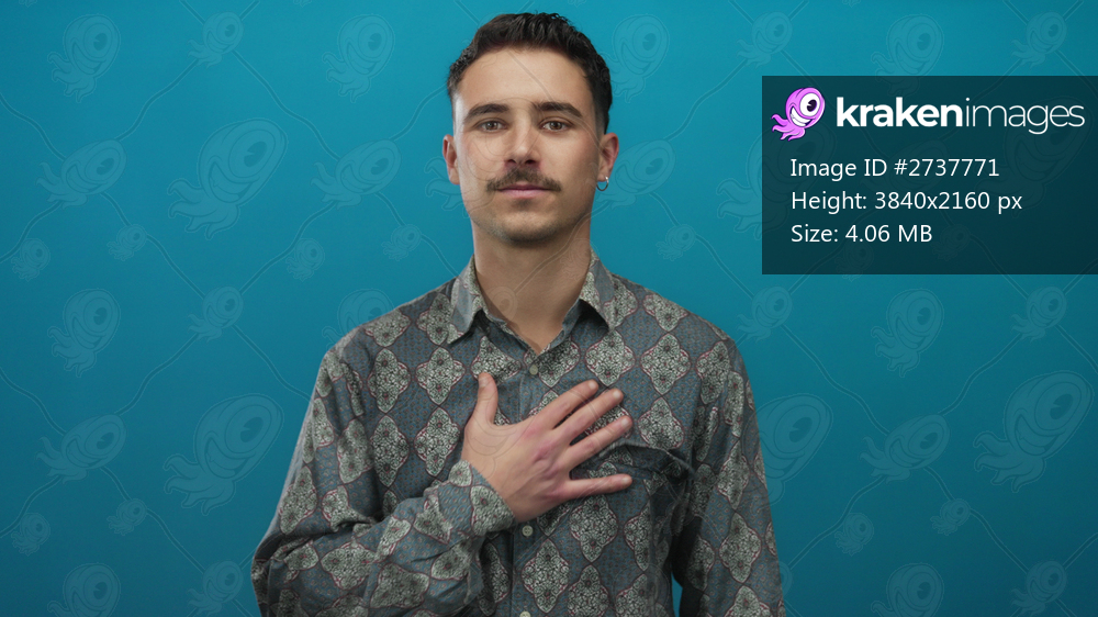 Young hispanic man standing against blue wall with hand on heart, expressing emotion and wearing patterned shirt, isolated background perfect for sincerity concept. - Kraken Images