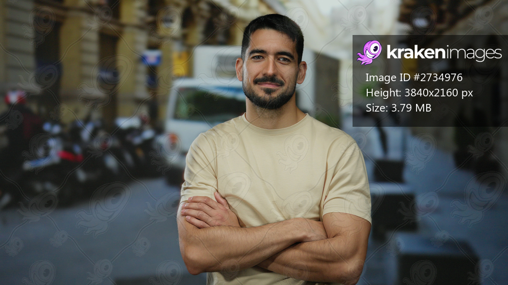 Young hispanic man standing with arms crossed on a vibrant urban street with yellow taxi featured in the background, exuding confidence and charm in a casual tshirt. - Kraken Images