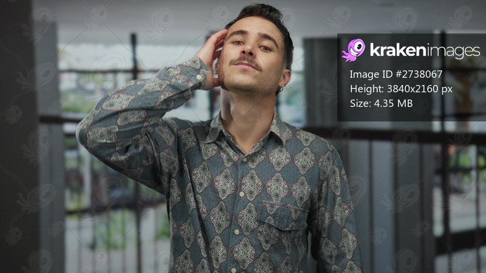 Young hispanic man standing confidently indoors in a modern hotel hallway, showcasing casual style and contemporary fashion setting.