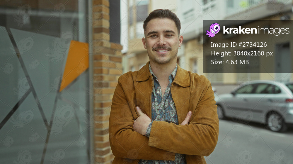 Young hispanic man standing confidently on an urban street wearing a brown jacket with folded arms and smiling near cars and buildings.
