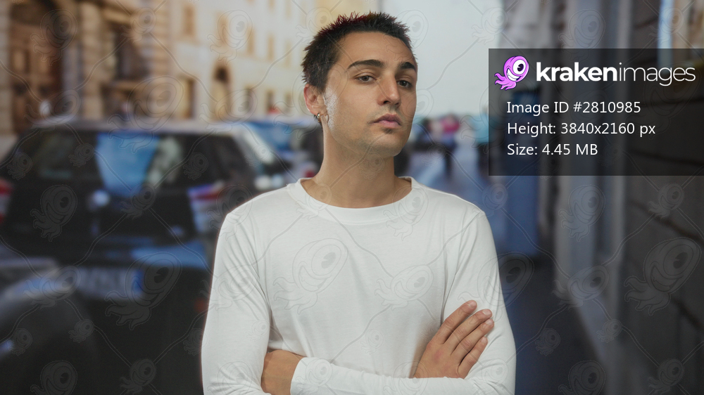 Young hispanic man standing with crossed arms on an urban street, reflecting city life in a vibrant bustling town backdrop with cars and pedestrians blurred in the background. - Kraken Images