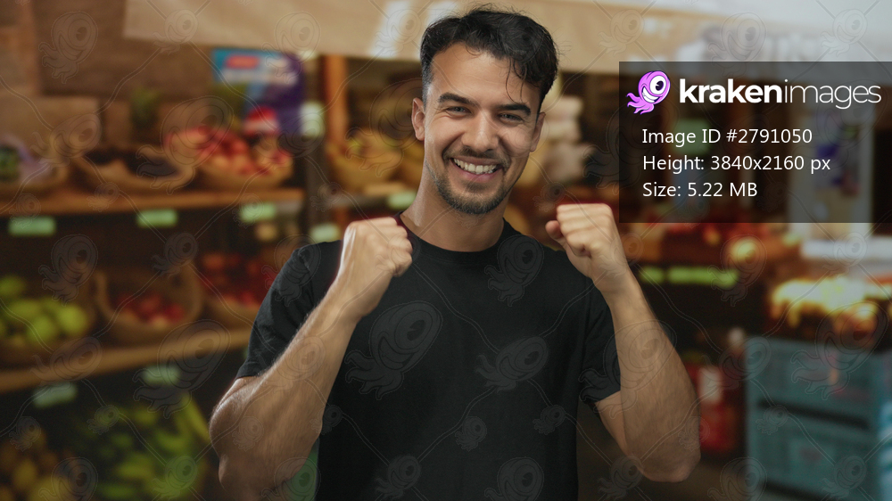 Young hispanic man standing in an outdoor fruit shop market smiling with enthusiasm amidst fresh produce and vibrant colors showcasing lively market atmosphere - Kraken Images